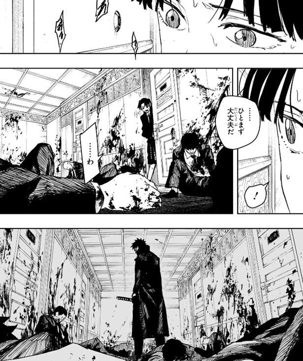 チヒロが斬り合っている様子をイヲリはドアスコープ越しに確認しますが、すぐに血で何も見えなくなります。男の叫び声が何度か聞こえた後チヒロから、…ひとまず大丈夫だ、と言われドアを開け見ると、そこにはたくさんの血塗れの死体があり、チヒロが一人だけ立っていました。