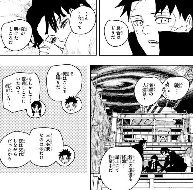 一方、目を覚ましたイヲリにチヒロは現在朝で、巻墨は屋上で封印の準備を三人でしていて、封印の準備も終盤である事を伝えます。さらにチヒロは夜は交代しながら見張りをして、見張りをしていない時は巻墨から戦闘法を聞いたり、剣術の練習などをやったりしていた、とイヲリに言います。イヲリはチヒロに学校とかは?と聞きますが、学校は通った事はないとチヒロは答えます。