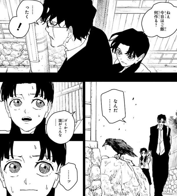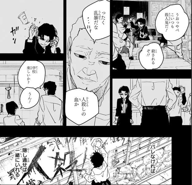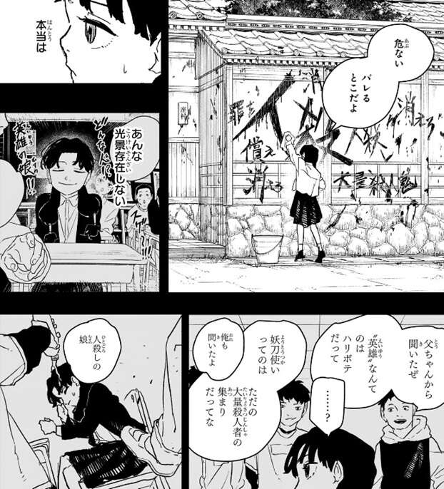一方、イヲリは座村宅前の落書きを消していました。実は、英雄の娘とチヤホヤされた光景は嘘のようで、“英雄”なんてハリボテ、妖刀使いはただの大量殺人者の集まり、と学校ではイジメられいてたようです。しかし、イヲリは父親である座村を苦しい目に遭わせたくなく、また父親が遠くに行ってしまいかもしれないと、学校でのことを座村に明かせずにいました。