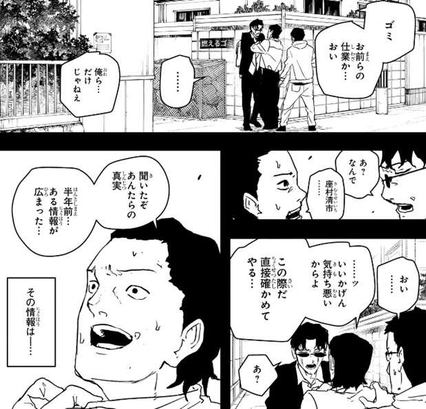 落書きまであったのは今回が初めてのようですが、座村はゴミが誰の仕業かを問い詰めます。しかし、ゴミをバラまいたのは彼らだけではないようで、さらに座村たちの真実を聞いたと話し始めます。半年前、ある情報が広まった、と言い、少国民の掃討や剣聖が起こした事件について広まっている事を座村は知ります。