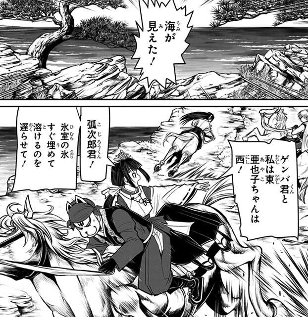 妻子が全員、安全圏に逃げた事を確認した時行と保科は、全軍に撤退を開始させます。時行と保科とわずかな兵が残って殿を勤めて敵を引き付けますが、国司は敵が逃げ出したのを知り、護衛は必要ないから敵を追いかけて戦って来いと市河に命じます。吹雪は市河の軍が国司の護衛から離れる事を予想し、川中島の朝霧に身を隠して国司を直接狙います。