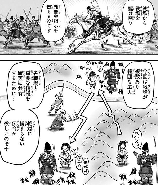 大将を配置転換し戦力を「中」の戦場に集めて、一気に保科党が勝負を決める作戦を立てて時行は作戦を伝えに「中」へと伝令に走ります。しかし、貞宗は敵の作戦を読んでいて、本体の騎馬100騎を「中」の戦場の援軍に配置します。さらに貞宗は100騎を使って伝令として「中」の戦場に向かっていた時行も捕らえようとしますが、そこに諏訪頼重(信濃仮面)が極秘の援軍として現れます。