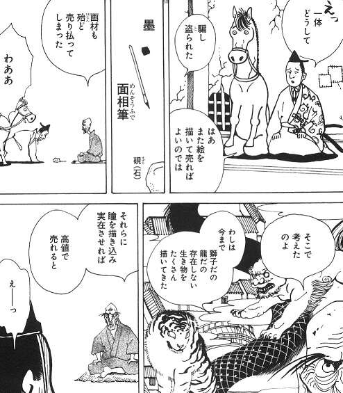 絵描きの高川百祿は都いちとも謳われた画家で、その筆の運びの巧みさに描かれた生き物はたちまち髪を飛び出してしまうので、必ず片側の瞳だけは描かなかったと言います…。しかし、今の百祿は詐欺にあって金がなく、息子は都で医師をやっていますが二十年会っておらず、妻は百祿が詐欺にあった時真っ先に残った金を持って逃げ、弟子は詐欺を働いた張本人でした。百祿は画材も売り払ってしまっていて新たに絵を描くことも出来ず、昔描いた絵に瞳を書き込み実在させて、高値で売ろうとします。