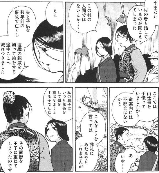 夫と子供を数年前に事故で亡くしたヨウは、父王の為に必死な王子に亡き子供の面影を重ねて、道案内の協力を申し出ます。