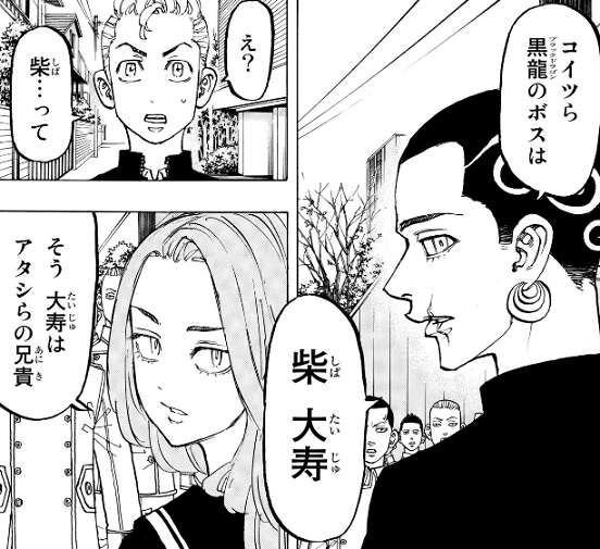 八戒の自宅前には黒龍の集団に遭遇してしまい、武道が東卍の壱番隊 隊長だと知られると一瞬即発の空気になってしまいます。八戒のおかげでとりあえず衝突は回避しますが、八戒と柚葉の兄 大寿が、黒龍の総長だという事が分かります。