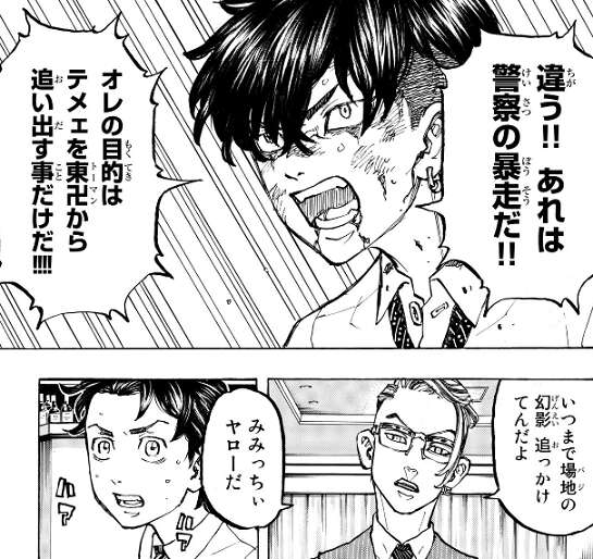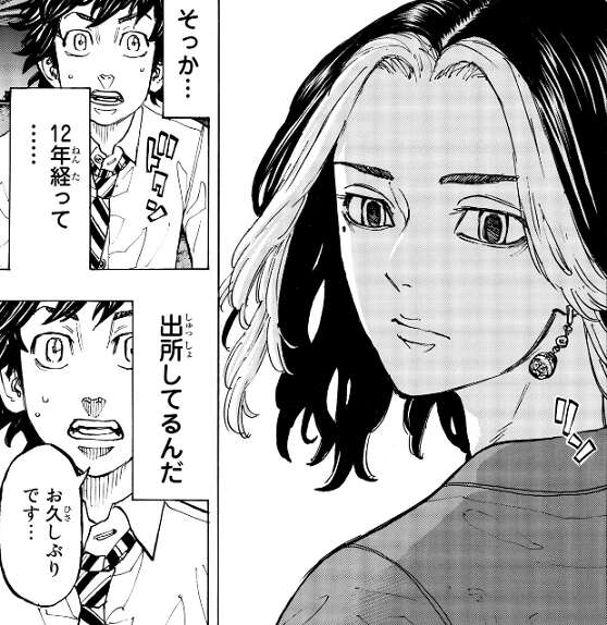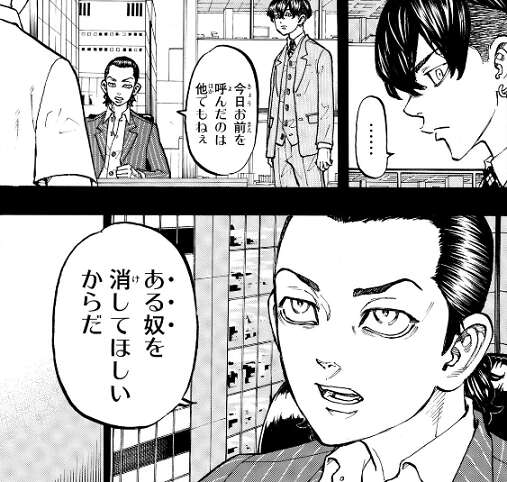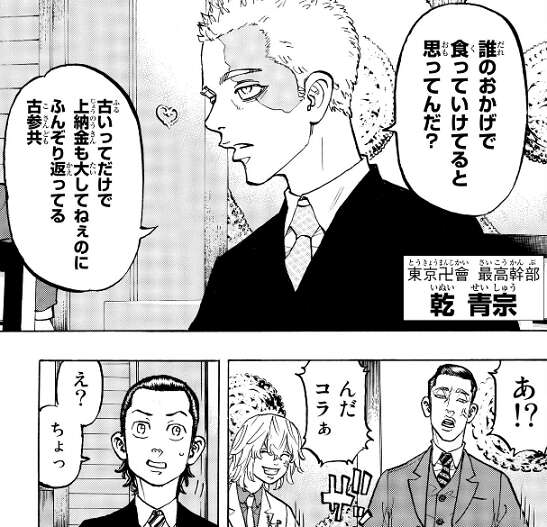 現代に戻った武道は東卍の幹部となっていて、東卍幹部の集会に出席する事になります。東卍幹部の集会場では、三ツ谷以外の元隊長、林(ペーやん)も出席していて、12年経ってもみんなが変わらず東卍にいる事に、武道は安心します。しかし、その直後元黒龍組と呼ばれる、柴や乾達が集会で幅を利かせている状況に、武道は困惑します。