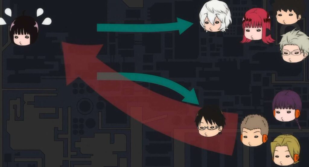 柿崎隊は弾幕で押してやや広い場所に出て、空閑を包囲する考えですが、空閑は柿崎に至近距離でまとわりついて柿崎隊に射撃をさせません。さらに、柿崎隊が近距離戦用にシフトチェンジすると、空閑はワイヤー機動に移り柿崎隊を近づけさせません。柿崎隊はワイヤーを排除し、空閑に近づこうとします。