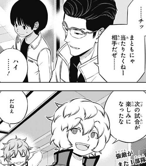 空閑は記録で見るよりずっと速いと感心します。帯島と空閑はお互い戦闘の礼を言い、弓場にも次の試合でリベンジします、と空閑は宣言して部屋を去ります。弓場はまともに当りたくない相手だと言い、空閑も次の試合が楽しみになってきたと次回、最終戦に向けて気合を入れます。