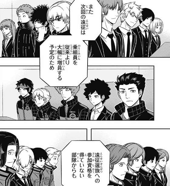 また次回の遠征は乗組員を従来より大幅に増員する予定のため、遠征選抜への参加資格を得ていない部隊からも個人で幾人か遠征隊員を選ぶ可能性がある、と城戸は全員に説明します。これは以前、木戸が三雲達に説明した内容です。最終的に遠征に参加するかは本人次第のようですが、断っても選抜試験に通ったという実績と評価は消えることはないそうです。