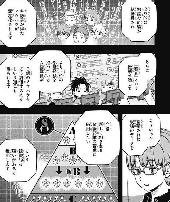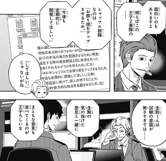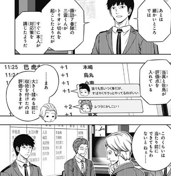 具体性の高さという点で、王子より染井の方がわずかに勝る印象だと、根付が言うと、選抜試験にB級を入れてシャフルした理由の、7割くらいは言い当てられている、と唐沢は評価し、染井も幹部候補に入れいていいのでは?と、言います。しかし、唐沢の意見に根付は、優秀かもしれないがまだ若すぎます、と否定的です。さらに6番隊では木虎が、染井と王子に近い意見を述べている、と城戸が言いますが、6番隊は古寺隊長が時間を制限していたため、木虎はそこまで具体的な話を言わなかったようです。