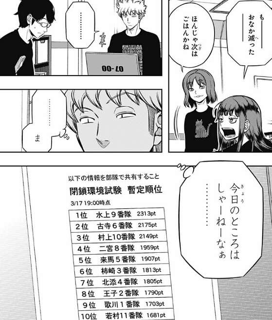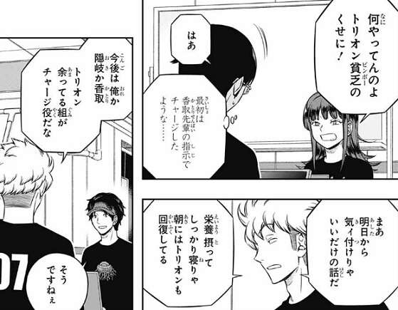 すると諏訪が、三雲のトリオンが切れたんじゃないかと指摘します。もう一回『手形』に触れてチャージするように、諏訪が三雲に言いますが、三雲が『手形』に触れても全く反応せず、チャージされません。三雲は最初とさっきのチャージで、トリオンを全部使ってしまったみたいだ、と諏訪は言います。それを聞いた香取は、何やってんのよ トリオン貧乏のくせに!と、三雲を怒ります。しかし、最初は香取先輩の指示でチャージしたような……、と三雲は納得がいかない様子です。諏訪は栄養を撮ってしっかり寝れば、朝にはトリオンも回復するだろうと言いますが、仕事時間が今日はあと8時間あり、三雲が課題を出来なかったら、他のチームと差がついちゃうじゃない!と、香取が怒ります。