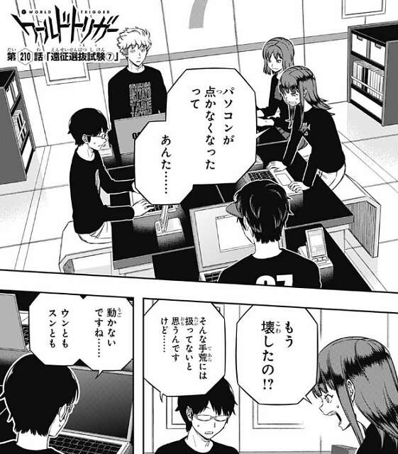 三雲のパソコンが点かなくなった原因ですが、予想通り三雲のトリオン切れが原因のようです。香取は三雲に怒っていますが、207話で触ってみたらと三雲に言ったのは、確かに香取なので少し理不尽ですね。