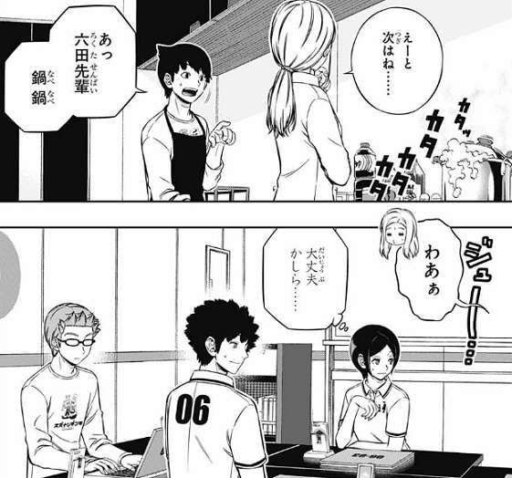古寺6番隊も夕食の準備中で、漆間隊のオペレーター・六田と奥寺が夕食を作っています。奥寺が食材をカットし、次になんかありますか?と、聞くと、六田は自分の鍋を放っておいて、考え始めてしまいます。奥寺から鍋を指摘され六田は慌ててしまい、その様子を見ていた木虎は内心、大丈夫かしら……、と心配します。