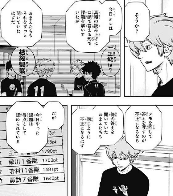 他でも玉狛第2の空閑、ヒュースがいるチームは順位が下で、それぞれ対策を立てます。諏訪7番隊では三雲が頑張る、歌川1番隊では空閑は志岐ではなく歌川に質問する、などです。ヒュースのいる若村11番隊は、ヒュースが答えのメモを全員で回し見るという方法を提案します。普通ならカンニングですが、ヒュースは特殊な解決方法が必要になる場合もある、と言い、結論は隊長の若村に一任されます。果たして、若村はヒュースの方法を採用するのか?さらに、ラストで古寺が感じたこととは何か?2日目からは戦闘シミュレーション課題も始まりますし、この先も波乱がありそうで話の展開が楽しみです。