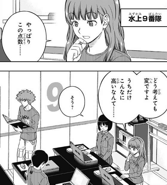 そして、トップを独走中の水上9番隊は照屋が、自分のチームの点数に疑問を持ち始めます。2位以下にあまりに点差をつけて独走しているので、いくらなんでもおかしいと感じたようです。水上は戦闘シミュの事をチームメイトに打ち明けるのでしょうか?