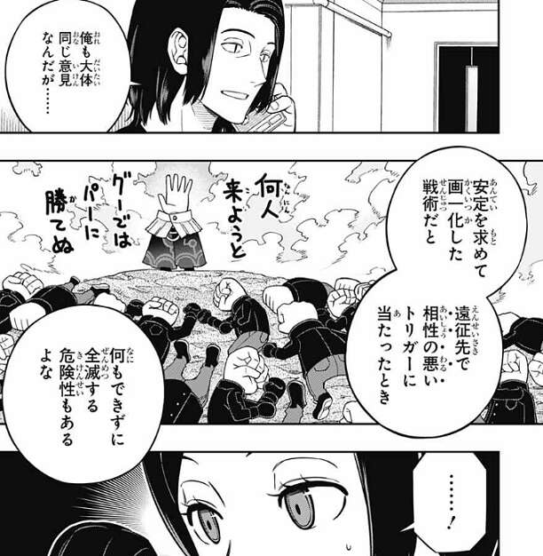 一方、木虎からメールを貰った東は木虎に電話をして課題のアドバイスをします。しかし、あれで十分だと言う東に対して、それでも納得がいかない木虎は東との回答の違いを教えて欲しいと質問します。すると東はジャンケンに例えて、安定を求めて画一化した戦術だと、遠征先で相性の悪いトリガーに当たった時何もできず全滅する危険性もある、そうならないように隊員、戦術、トリガーなどあらゆる手札に『幅』を持たせる狙いが、今のランク戦にはある、と自分の考えを木虎に伝えます。