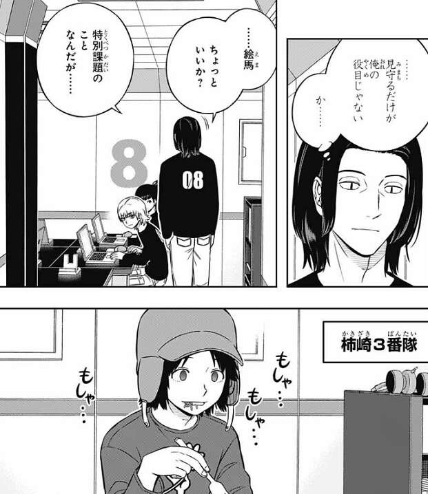 閉鎖環境試験ではちょくちょくモメるかもですけど、柿崎に当てにしてもらった戦闘試験ではちゃんとやるので安心してください、と犬飼は柿崎に対して言いますが、柿崎は影浦と犬飼を採った理由は戦闘試験だけじゃない、と言います。