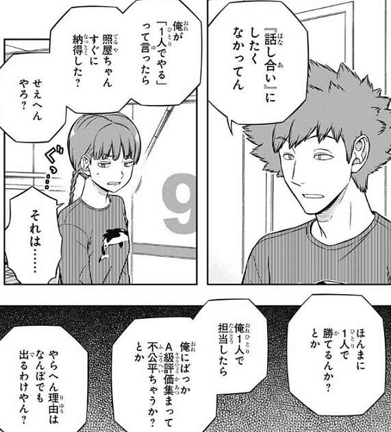 しかし、水上はこのメンツならいけるやろ、それができるメンツを集めたつもりやで?と、照屋に言います。そして水上は、俺の釈明はこれで全部やな、と言い、……他になんか要望があれば聞くけど?と、照屋に質問します。