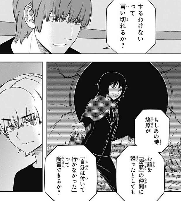 絵馬に鳩原失踪の真相を伝えた二宮は、ちゃんと自力で試験を突破するように念を押します。上層部は鳩原の真似をして、ネイバーフッドに密航する人間が出ないか懸念しています。そんな真似をしないように二宮は念を押しますが、絵馬はそんなことするわけないと言おうとします。