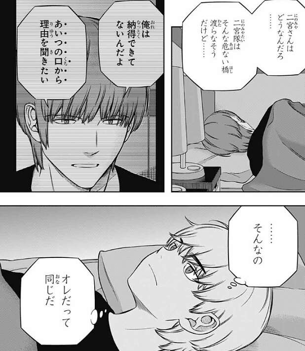 しかし、もしあの時鳩原が絵馬を『密航』の仲間に誘ったとしても、「自分は付いて行かなかった」って断言できるか?と、二宮に言われて絵馬は何も言えなくなってしまいます。さらに絵馬が選抜に漏れて、それでも鳩原を探したいと言ったら、影浦隊の連中はなんだかんだ協力しようとするんじゃないのか?と、言われて絵馬は何も答えられません。