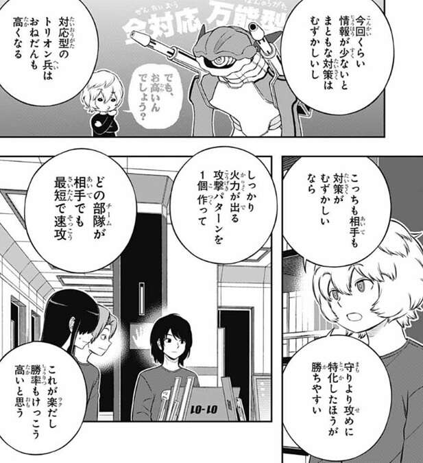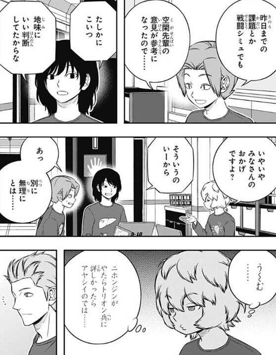 歌川が、方針を決めたいとこだが…、と言いますが、漆間が、相手がどんなユニット作るかわかんねーんだから作戦の立てようがねーだろ、と言い、戦術のパターンが無限すぎて予想できないよね……、と志岐も同意します。チームの方針決めに悩んでいると、巴が空閑の意見を聞いてみたいと言います。空閑の意見は課題や戦闘シミュでも参考になったようで漆間も同意しますが、空閑はニホンジンがトリオン兵にやたら詳しかったら怪しいのでは、と自分がネイバーとばれるかもと悩みます。すると、玉狛は遠征にも行っているし、宇佐美先輩もいるからトリオン兵にも詳しそうだな、と歌川が助け船を出します。