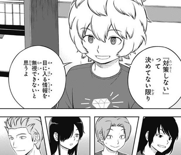 さらにどこのチームも昨日までの戦闘シミュの経験があるから、『対策しない』って決めてない限り、目に入る情報は無視できないと思うよ、と空閑が意見を言うと、歌川が速攻戦術用のユニット作りと、相手を惑わせるアイデアを詰めていこう、と歌川隊の方針を決定します。メンバー全員、空閑の意見と歌川の方針決定に賛成し、早速作業に取り掛かります。