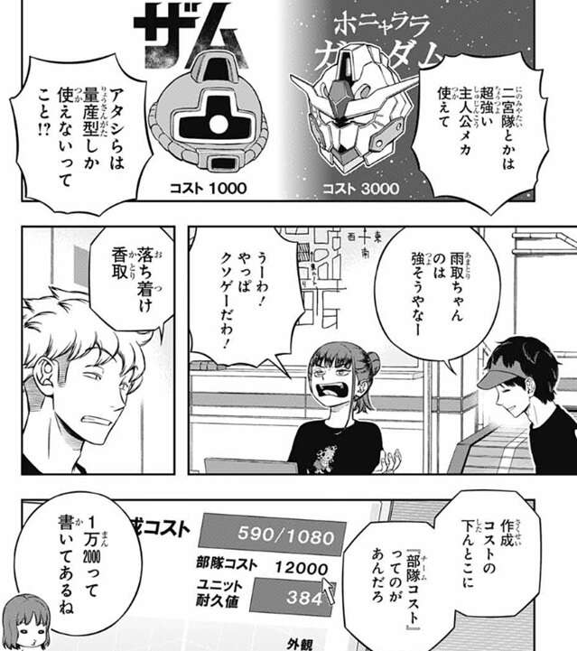 トリオン量によって作成コストが決まると分かり、二宮隊のようにトリオン量が多い隊員ばかりの所は、強いトリオン兵を使えて、諏訪7番隊は量産型のトリオン兵しか使えないってこと?と、叫びます。確かに雨取が作ったトリオン兵はかなり強そうで、香取は、やっぱクソゲーだわ!と、叫びます。しかし、『部隊(チーム)コスト』というのがあり12,000と表示されていて、この値が1試合で使えるユニットのコスト総数を表しているようです。つまり、強いトリオン兵は作成コストが高いので出撃できる数も少なくなり、弱いトリオン兵なら出撃できる数は多くできそうです。