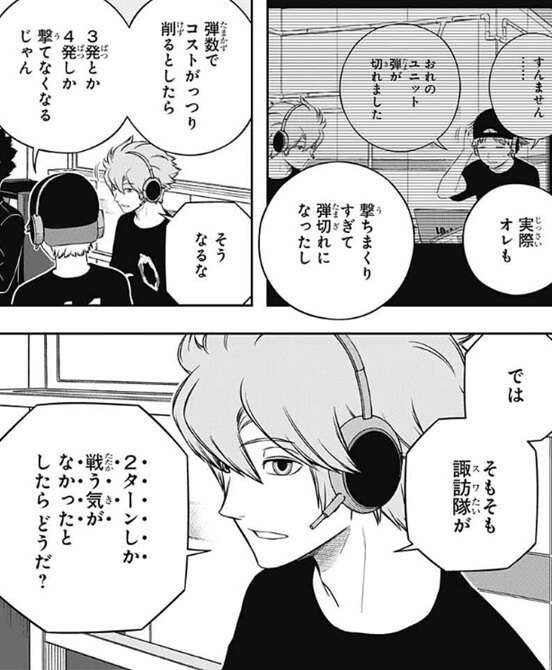 半崎は三雲がこの作戦をマジで考えてんの?とヒュースに聞き、ヒュースがこの推測が当たっていればの話だがなと答えると、これを初日に思いついて形にしてんのがすげえわ、と三雲に驚きます。そこが修の強みといえなくもない、とヒュースが答えると、B級2位は伊達じゃないってことだな……、と笹森も三雲の発想力に驚きます。