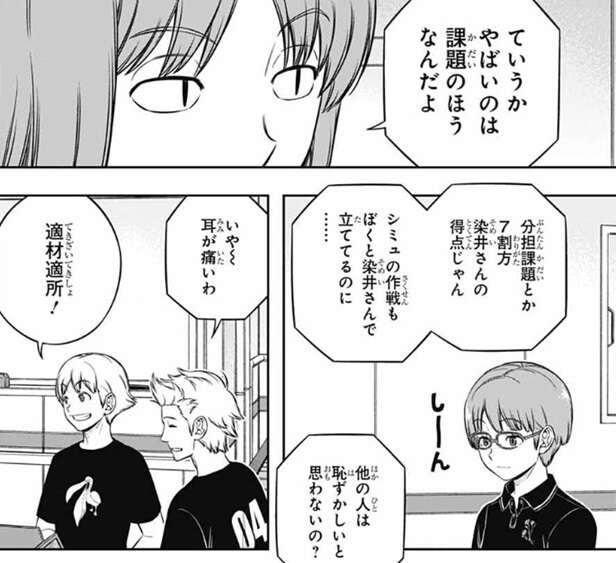 それよりやばいのは課題のほうだと菊地原は言い、分担課題の7割方は染谷の得点でシミュの作戦も菊地原と染谷で立てているのに、他の人は恥ずかしいと思わないの?と、菊地原は厳しい意見を言います。しかし南沢は、適材適所!と言い余裕の表情です。