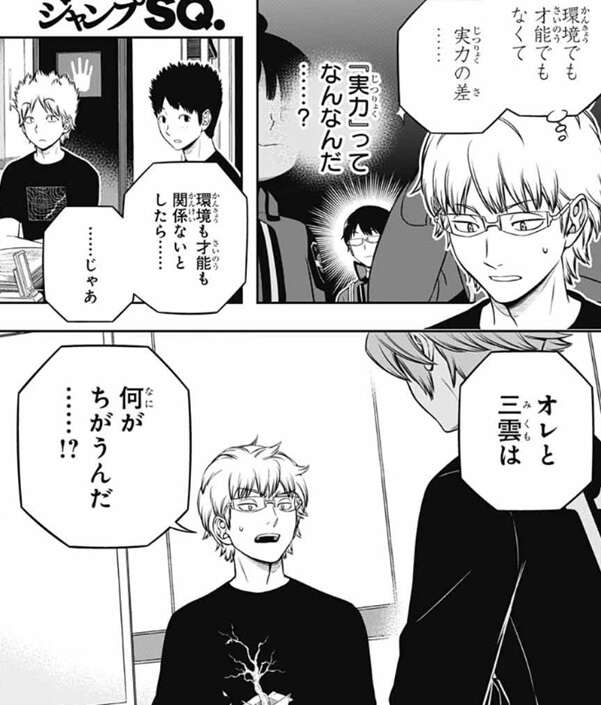 環境でもなく才能でもないとしたら……、……じゃあ、オレと三雲は何がちがうんだ……!?と、若村が疑問をヒュースにぶつけた所で今回は終わりです。