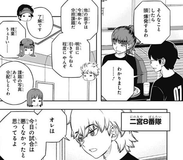 三雲以外は今晩から分担課題を、明日に引きずらない程度に残業で取り組んでいく事になります。一方、総合順位が7位に下がり単日8位だった二宮隊8番隊は、明日の特殊シミュの作戦会議をしています。総合順位は7位に下がりましたが、絵馬は今日の特殊シミュの試合は悪くなかったとメンバーに話します。加賀美の派手なユニットのおかげで、逆に雨取のユニットが相手の印象に残ったので、明日の敵チームは多分雨取のユニットを近づけないように、射程が長いユニットを増やしてくるんじゃないかと絵馬は予想します。