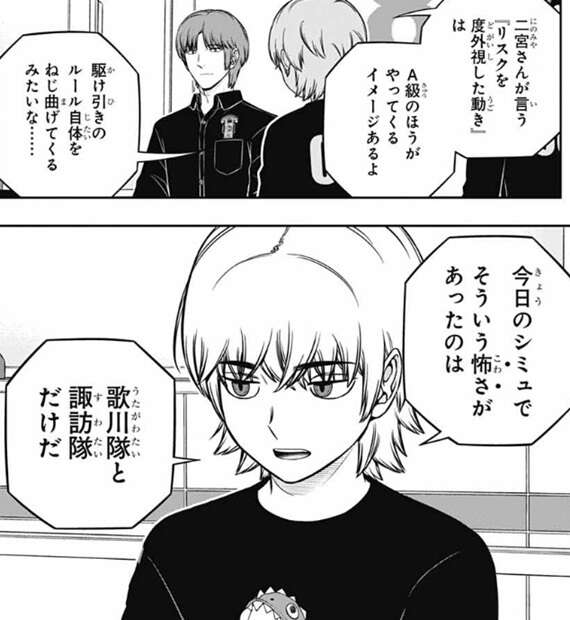諏訪は理由として昨日、今日とシミュでバカ勝ちしているからと言い、どういう状況か分かるか?とメンバーに聞きますが、三雲が戦闘シミュの初めの頃の水上隊と二宮隊を例に出します。水上隊と二宮隊は戦闘シミュで初めの頃バカ勝ちしましたが、目立ってしまい対策をされて勝ちにくくなり、成績を落としました。諏訪は諏訪隊も総合2位まで上がって目立ってきたので、対策されるのは当たり前と言います。香取は、だったら今日は作戦を隠しておいて配点が高い2日目に作戦を使い、がっぽり得点を取ればよかったと言います。しかし、使えるユニットが決まっている戦闘シミュと違って特殊シミュは自由度が高いと諏訪は言い、三雲もどこかのチームが今日諏訪隊と同じ作戦をやってくる可能性がそこそこあったと言います。