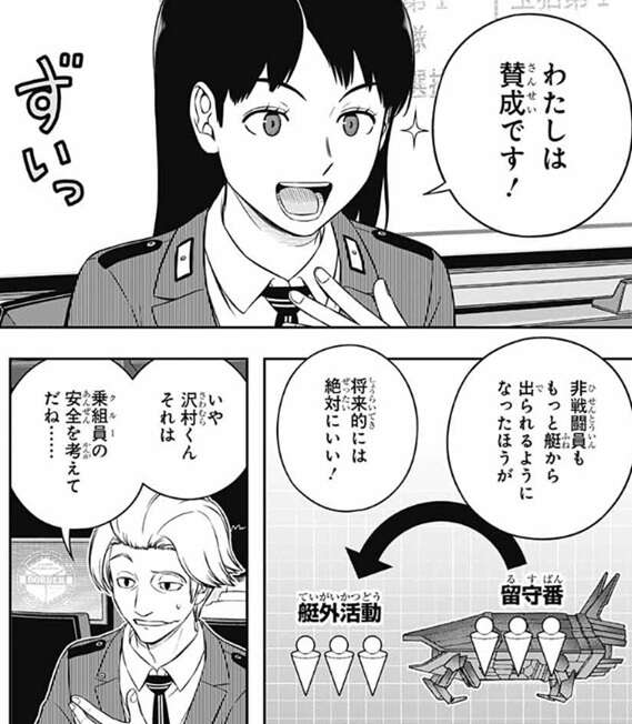 この追加ルールに根付は気が進まないようですが、沢村は、わたしは賛成です!と、意見を前面に出します。非戦闘員ももっと艇から出られるようになったほうが将来的には絶対にいい!!と、いう意見ですが根付はクルーの安全を考えると否定的のようです。