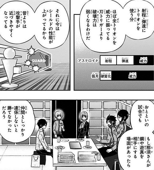 場面変わって東隊は、隊長の東を中心に次のB級ランク戦の作戦やMAP選びに関して、議論しています。