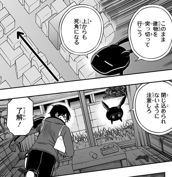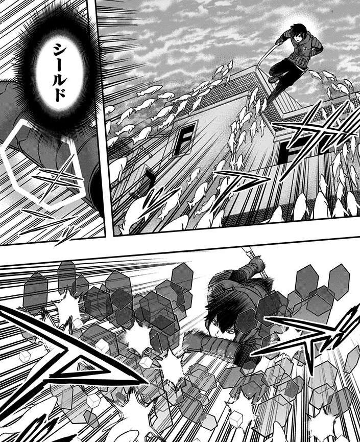 烏丸も緊急脱出しいよいよ後がありませんが、レプリカから突っ切るぞと言われ三雲は建物の中を突っ切ていきます。ハイレインの「卵の冠(アレクトール)」の特性をついていることに気づき、ハイレインはミラに下りてくるように命じます。